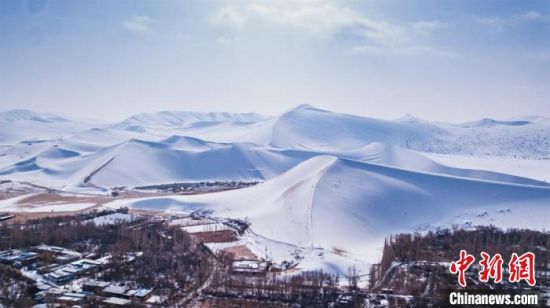 11月20日凌晨,甘肅敦煌降下2021年入冬以來的第一場雪。當(dāng)日上午10時左右,敦煌大漠雪后天氣放晴,被白雪覆蓋著的大漠山川銀裝素裹顯得分外妖嬈,遠(yuǎn)遠(yuǎn)望去鳴沙山白雪茫茫,沙雪交融,美景如畫,呈現(xiàn)出難得一見的北方雪國風(fēng)情。