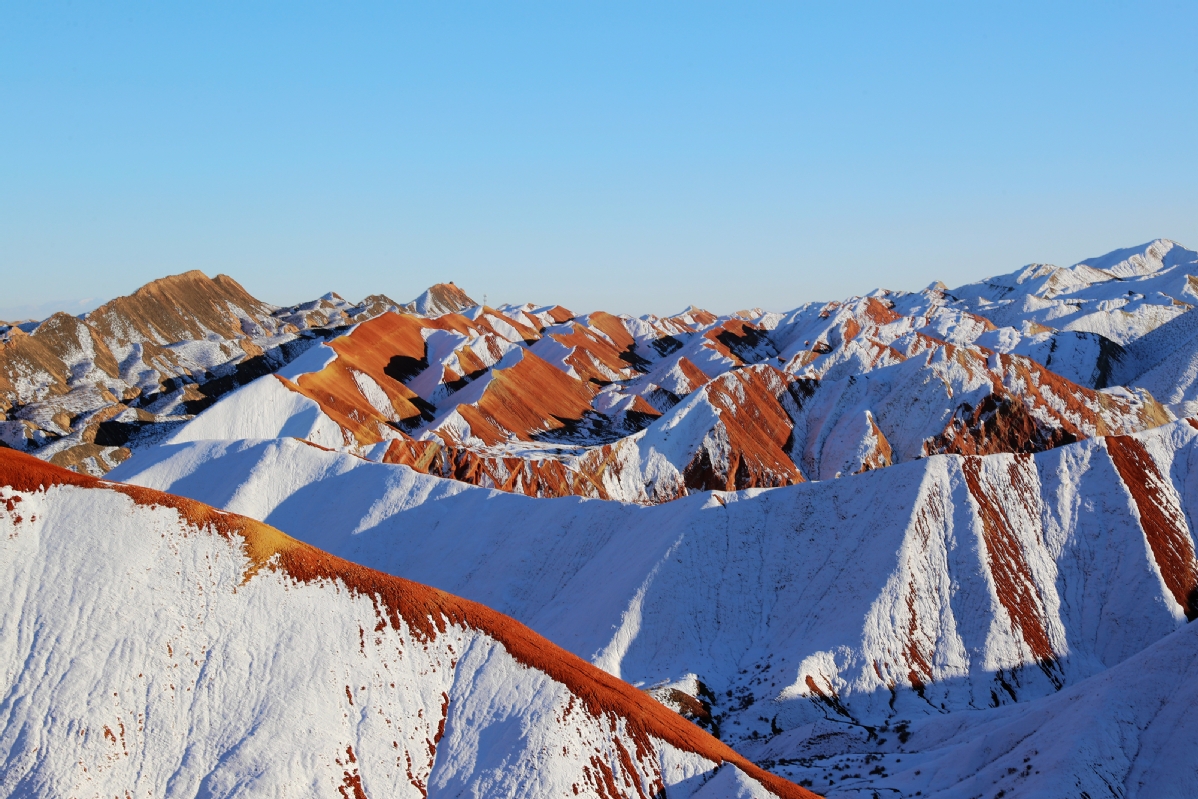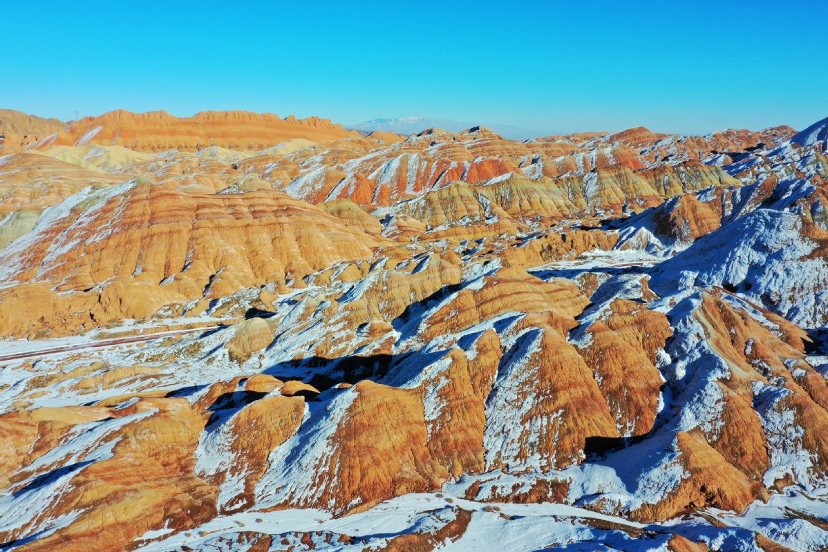 2021年12月12日,甘肅省張掖七彩丹霞在白雪的映襯下,層理交錯(cuò)、色彩斑斕,顯得格外艷麗多彩、美輪美奐。
