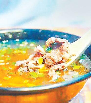 東門巷、喇家巷的牛雜割也上演著與肉酒一樣的故事,冬日里的牛雜割鋪?zhàn)涌偸切v騰的,在雜割湯翻滾的撲鼻中,一碗又一碗的雜割端上桌了。蒜苗與芫荽沫作為菜頭,讓一碗牛雜割青綠且香味撲鼻,拿了筷子,手心里一抹,而后咽一下口水,吸溜一口湯,目光跟著筷子在碗里攪動,留意牛舌多了一塊還是蹄筋少了,先巡察一番,然后咬一口白餅,喝口湯,幾口之后才吃雜割。