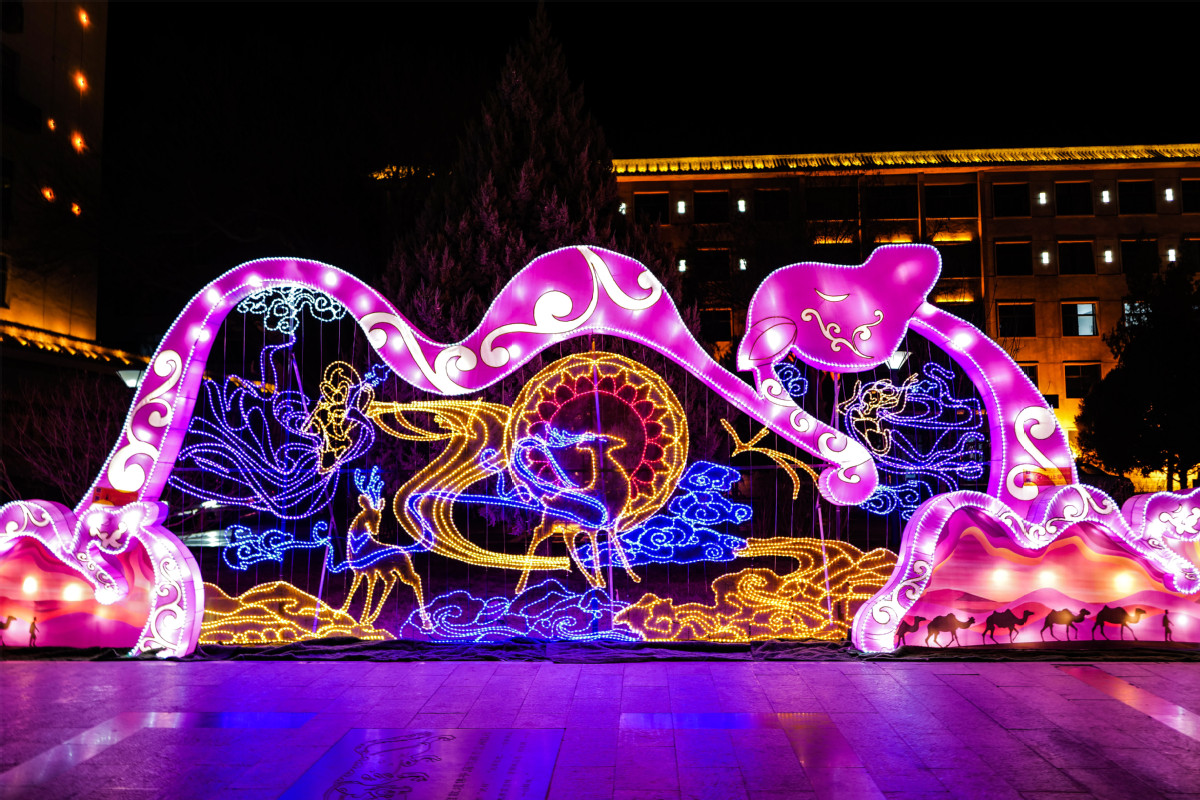 1月25日晚,甘肅省敦煌市“人類敦煌·心向往之”2022年新春文化燈展布置完成并亮燈,古郡敦煌大街小巷燈火輝煌,文化彩燈點亮古郡夜空。