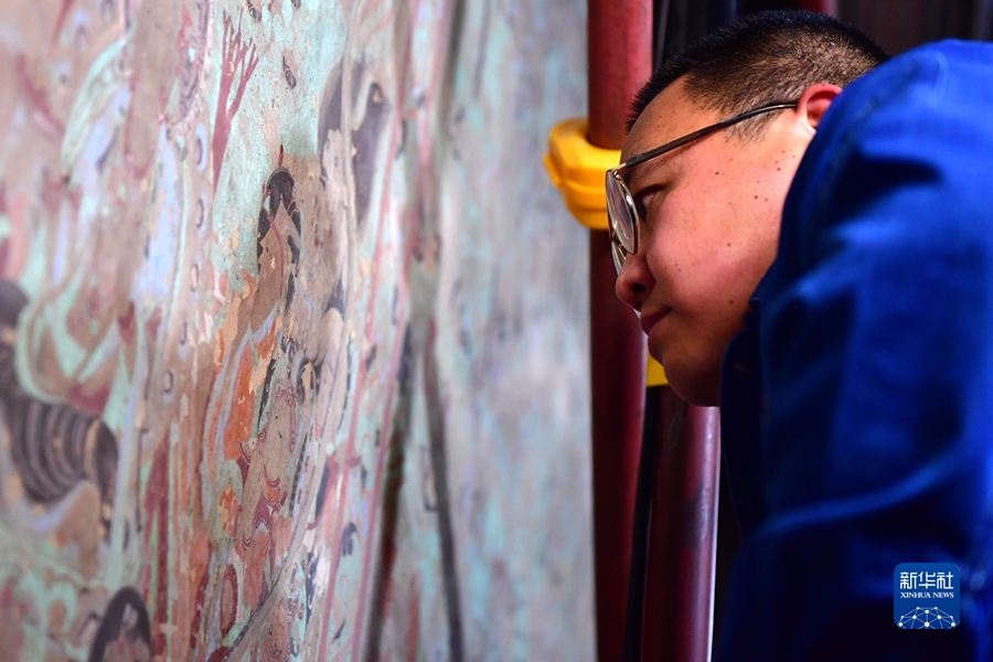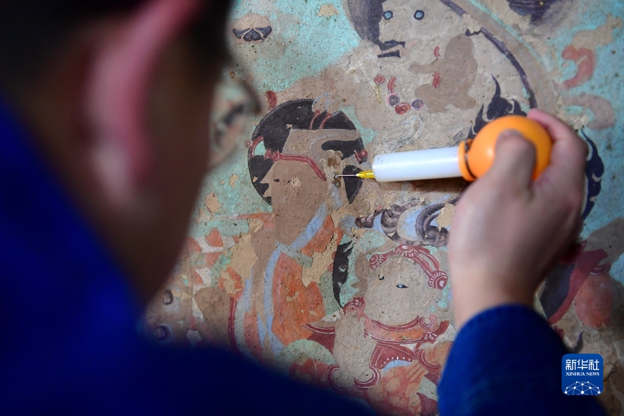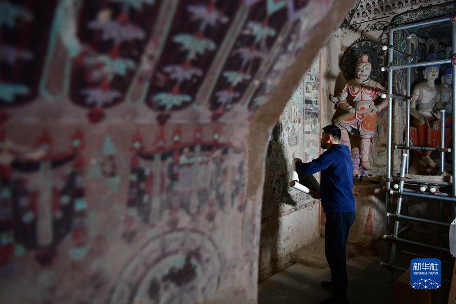 4月19日,在莫高窟第231窟,楊金禮在修復出現病害的壁畫。新華社記者 杜哲宇 攝