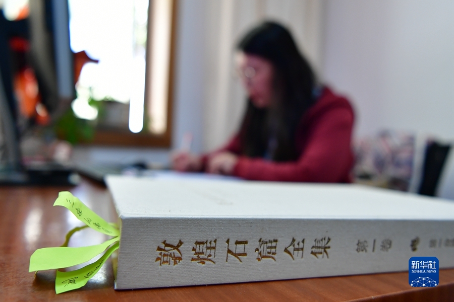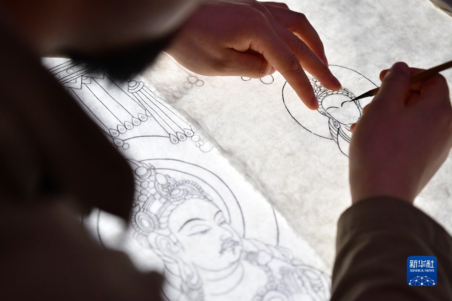 4月18日,在敦煌研究院美術研究所,劉小同在畫室內校對白描稿。新華社記者 陳斌 攝