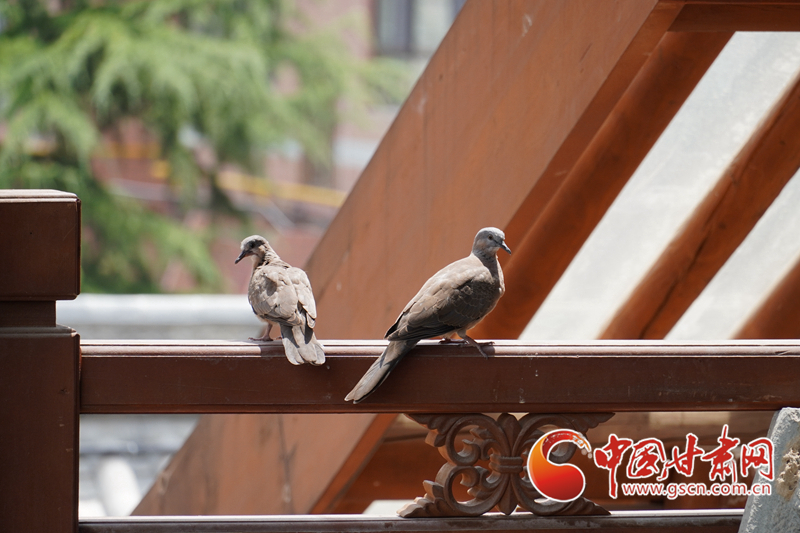 天水古城內(nèi),一只鳥飛向欄桿,隨后兩只鳥同在欄桿上站立不動。