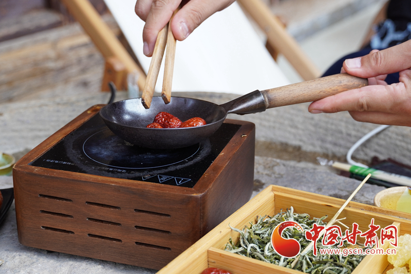 一家罐罐茶店內(nèi),顧客正在烤棗,散發(fā)出一陣棗香。罐罐茶是陜西、甘肅部分地區(qū)特色的喝茶習(xí)慣,古城里有不少罐罐茶店。