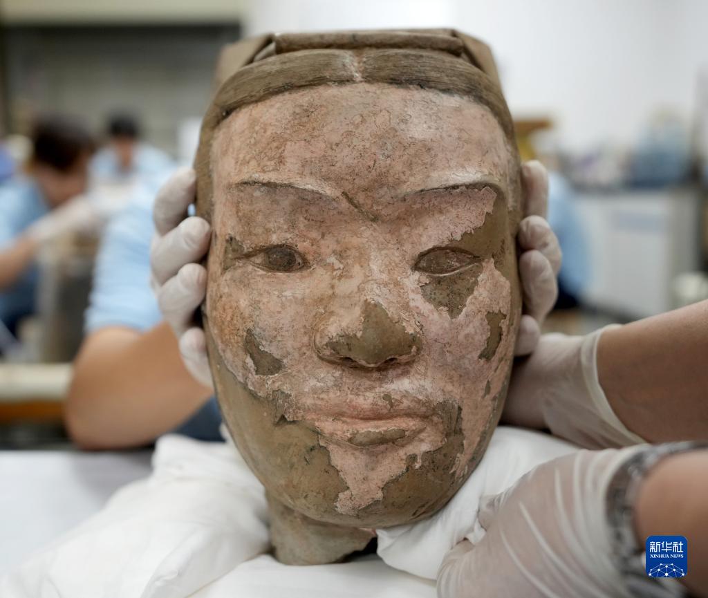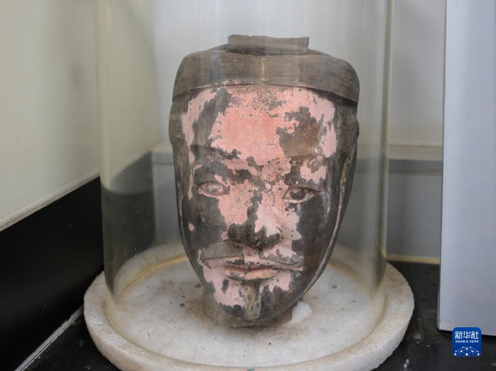 在秦始皇帝陵博物院文物保護(hù)部彩色陶俑修復(fù)室內(nèi),一尊秦俑臉部尚存部分彩繪層。秦俑五官的精準(zhǔn)塑造顯示出秦代匠人具有高超的寫實能力(8月23日攝)。