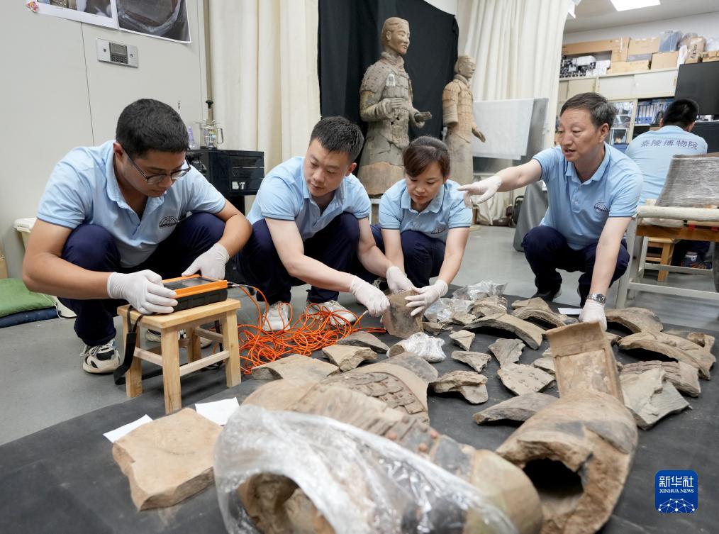 秦始皇帝陵博物院文物修復(fù)專家蘭德?。ㄓ乙唬┰谥笇?dǎo)技術(shù)人員運用超聲波儀器測量秦俑胎體的密度(8月23日攝)。