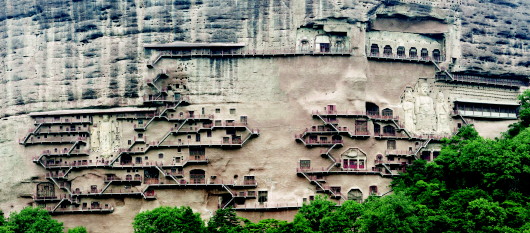 麥積山石窟與敦煌莫高窟、大同云岡石窟、洛陽龍門石窟齊名,是中國(guó)四大石窟之一,被譽(yù)為“東方雕塑陳列館”。公元759年杜甫流寓天水,作《山寺》詩:“野寺殘僧少,山園細(xì)路高。麝香眠石竹,鸚鵡啄金桃。亂石通人過,懸崖置屋牢。上方重閣晚,百里見秋毫。”其自然景觀與人文景觀完美結(jié)合,是世界文化遺產(chǎn)、全國(guó)重點(diǎn)文物保護(hù)單位,也是中原北方地區(qū)最早的皇家石窟,洞窟內(nèi)還保存了中國(guó)最早的連環(huán)畫作品。