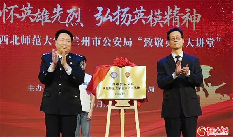 活動中,王立朝代表蘭州市公安局,接受了劉仲奎代表西北師范大學捐贈的8幅蘭州公安烈士畫像,向?qū)W校頒發(fā)收藏證書,并一同為“蘭州公安文聯(lián)西北師范大學藝術(shù)培訓基地”揭牌。蘭州公安竇勇烈士之子竇永杰、李鋼烈士之子李俊杰分別追憶父親的英雄事跡。“全國優(yōu)秀人民警察”、城關(guān)分局直屬大隊大隊長張子劍,“全國公安機關(guān)愛民模范集體”代表、市局刑警支隊電信網(wǎng)絡(luò)案件偵查大隊民警陳薈文分別作分享報告。學校師生和市公安局民輔警代表共同演繹詩朗誦《是誰》、合唱《少年壯志不言愁》,以多種形式緬懷英烈,致敬英雄。