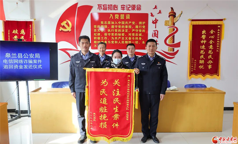 “沒想到還能追回被騙的錢,真心感謝皋蘭縣公安局的民警們。”返還儀式上,楊女士領(lǐng)回被騙資金,連聲道謝,并向辦案民警送上了一面印有“關(guān)注民生案件 為民追贓挽損”的錦旗,感謝民警全力偵辦案件,為自己挽回損失。