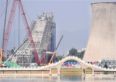 北京冬奧組委踐行節(jié)儉辦奧運,對首鋼老工業(yè)園區(qū)再利用,建成滑雪大跳臺等競賽場館?;┐筇_是冬奧歷史上第一座與工業(yè)遺產(chǎn)再利用直接結合的競賽場館。圖為2019年7月工人在改造滑雪大跳臺。新華社記者 張晨霖 攝