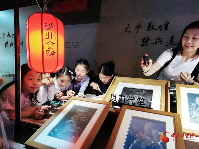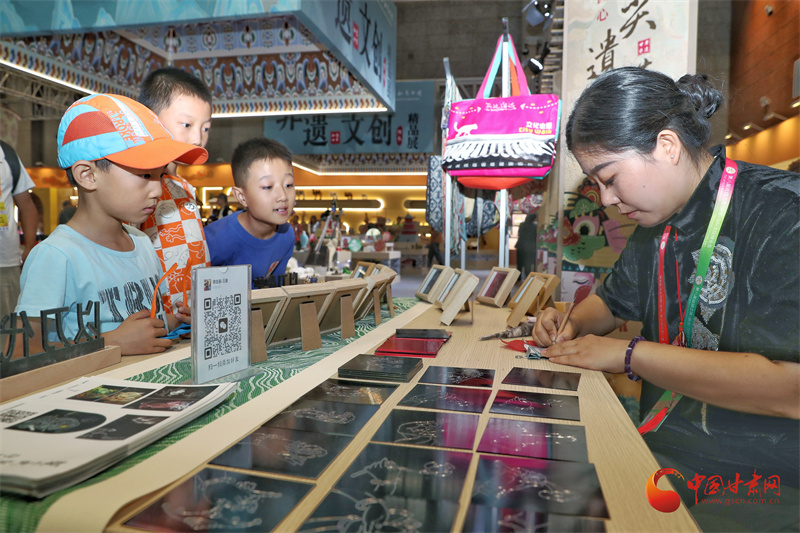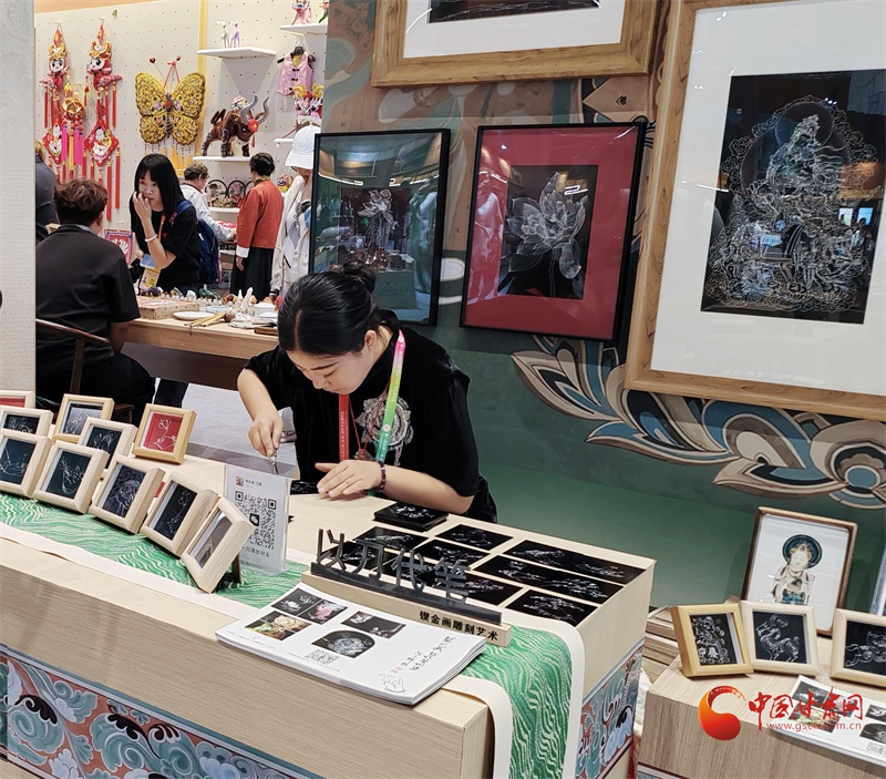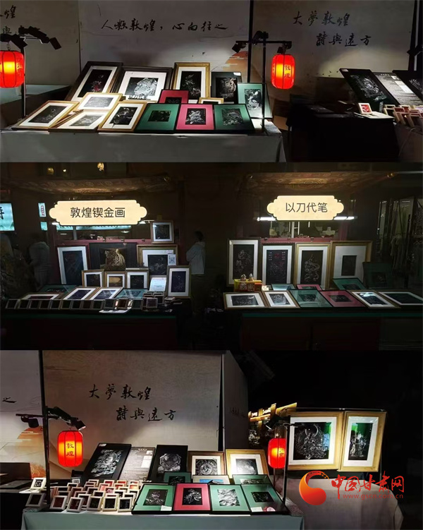 第八屆敦煌文博會(huì)非遺文創(chuàng)展區(qū),非遺藝人王婕正在展示鍥金畫(huà)技藝。通俗來(lái)說(shuō)就是在金屬板上刻畫(huà),每一個(gè)線條都要用刻刀在金屬板材上留下印痕。