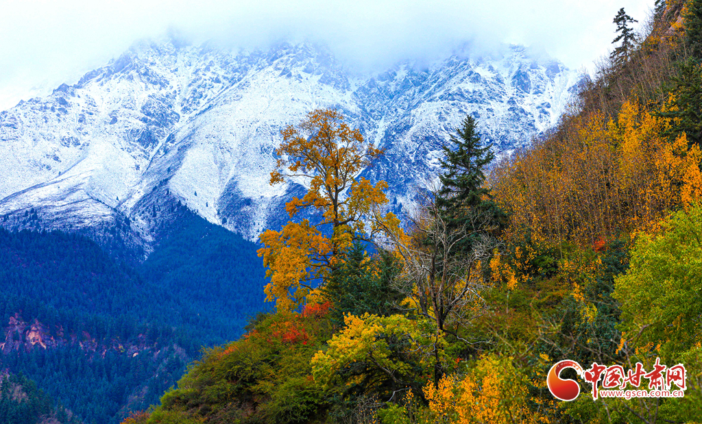 10月11日小雪初霽,祁連山國家公園肅南裕固族自治縣馬蹄鄉(xiāng)段,繪出一幅深秋畫卷。山頂覆白雪,山間繞輕云,層林盡染,色彩斑斕交織。