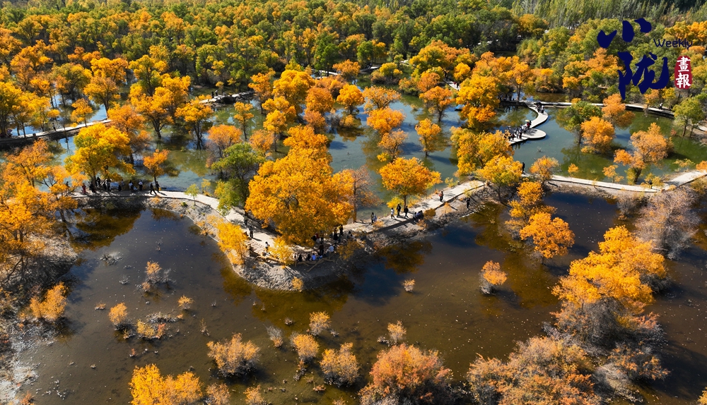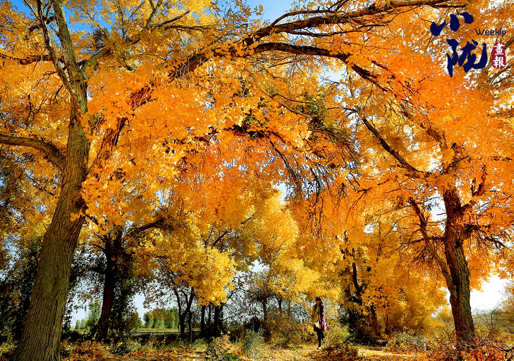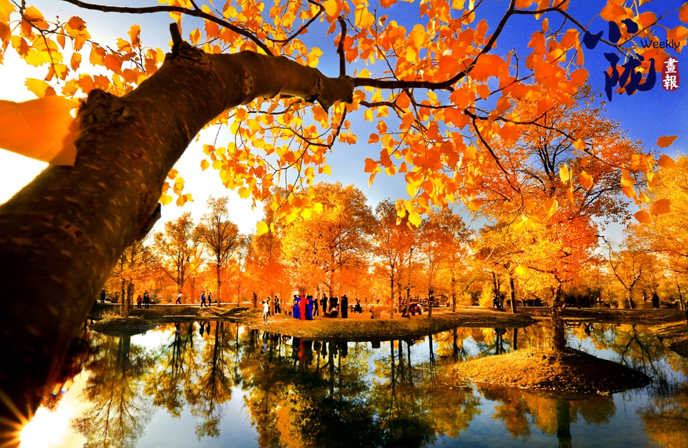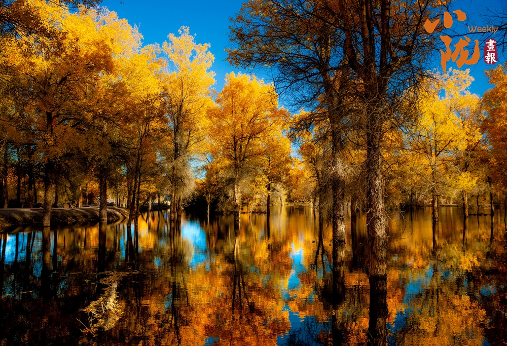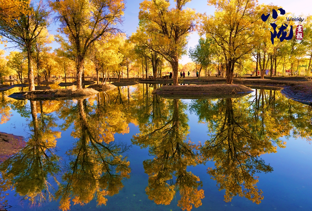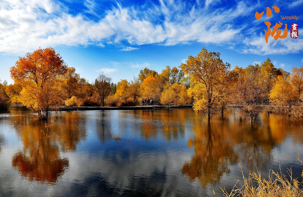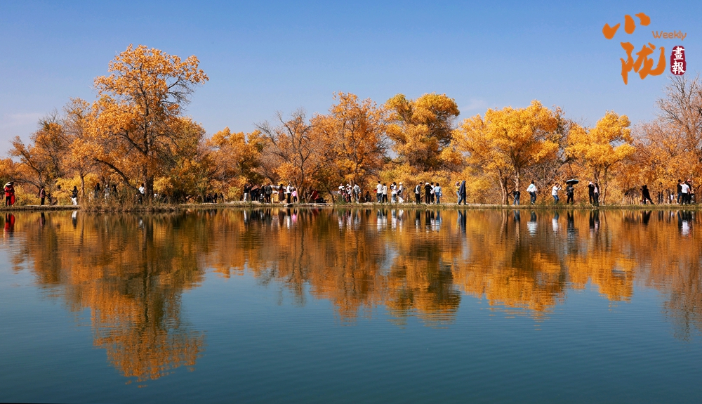 胡楊茂盛,疊翠流金,裊裊身姿倒影湖中。風(fēng)一吹,樹(shù)梢輕顫,成千上萬(wàn)片葉子像被點(diǎn)燃的火焰,在藍(lán)得沒(méi)有一絲雜質(zhì)的天空下翻涌、跳躍,充滿詩(shī)意。林間小道上,游客悠閑漫步,盡享美好時(shí)光。