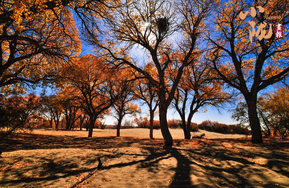 陽(yáng)光下,金色的樹(shù)葉映襯著湛藍(lán)的天空,在風(fēng)中婆娑起舞,把整個(gè)沙海點(diǎn)綴得生機(jī)勃勃。這個(gè)秋日,來(lái)金塔胡楊林,赴一場(chǎng)千年之約,享受“碧云天,黃葉地,秋色連波,波上寒煙翠”的視覺(jué)盛宴。