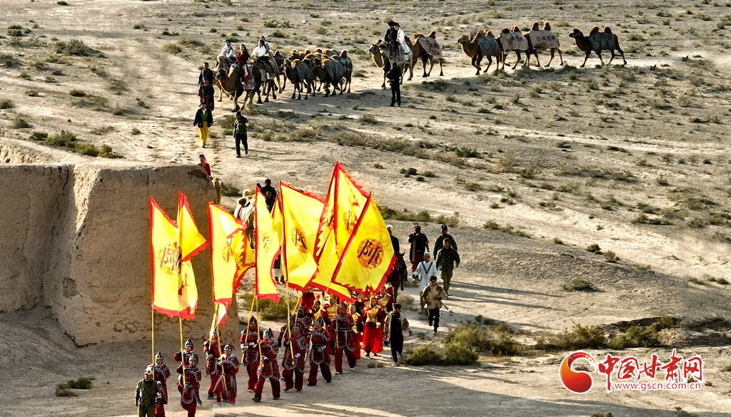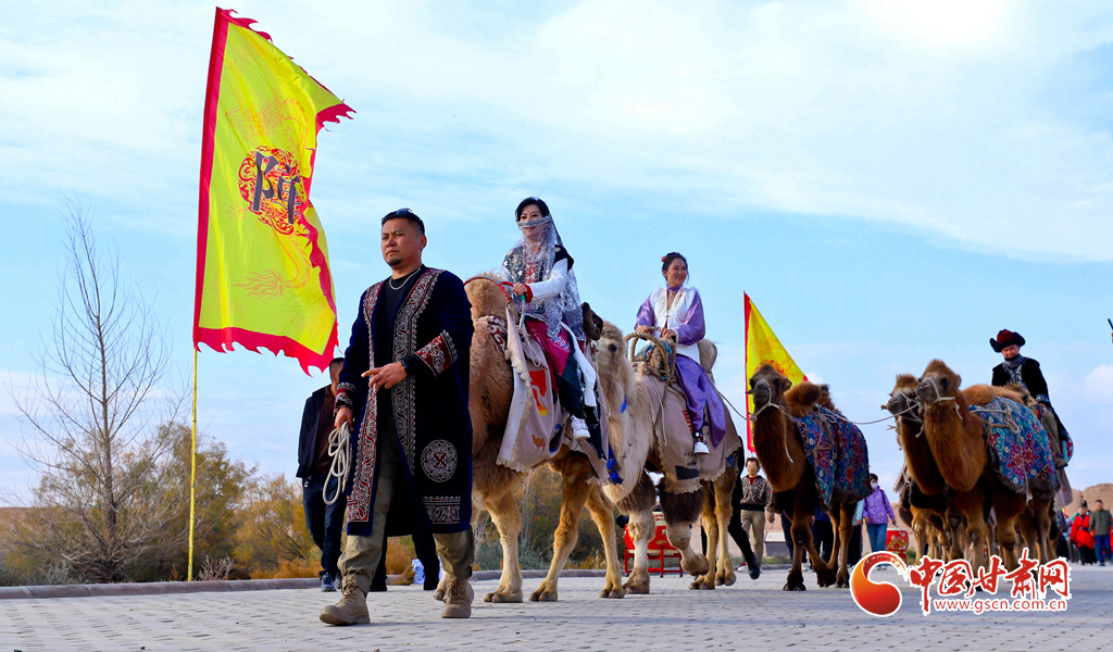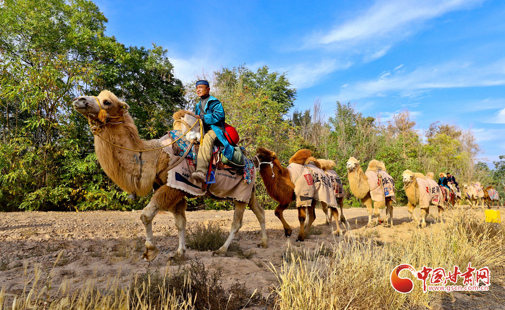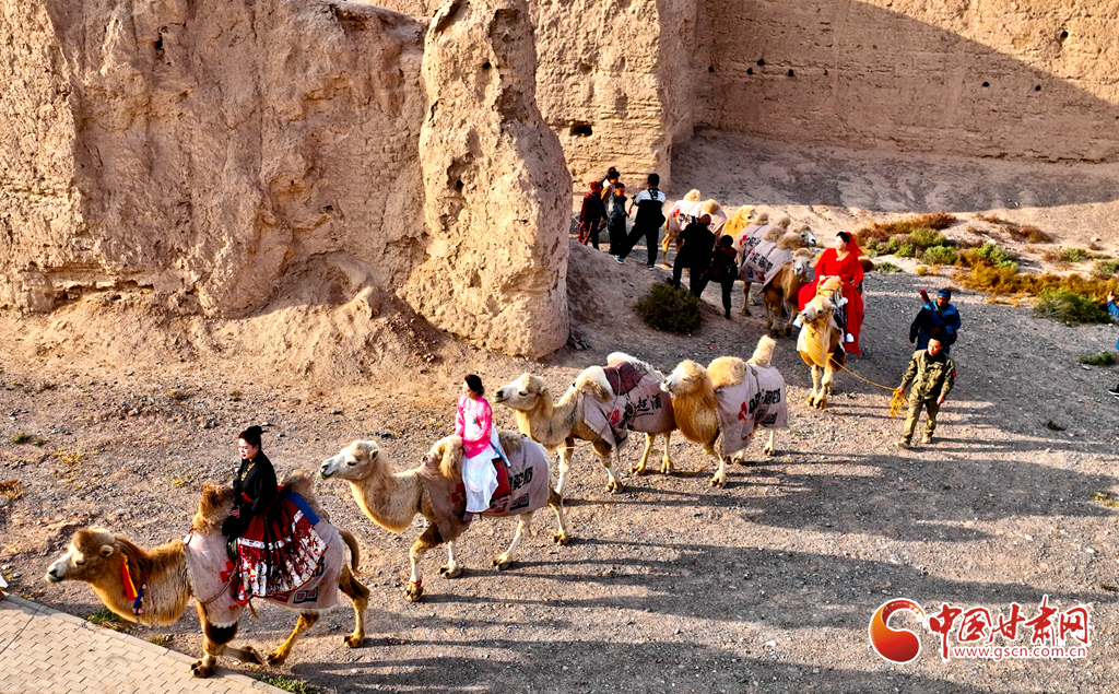 10月9日,一隊由33峰駱駝組成的駝隊行進在高臺縣境內(nèi)的絲綢之路大型漢唐古文化遺址——駱駝城遺址內(nèi),千年駱駝城又響起陣陣駝鈴聲。