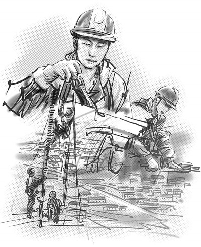 就個人條件而言,胡洪煒一米八的身高其實并不適合帶電作業(yè),但三年軍營練就的結實精壯以及先天的敏捷機靈完美地補充了身高的短板。多年之后,閆旭東依然清晰地記得徒弟曾經(jīng)帶給他的震撼。帶電作業(yè)兩大危險,一是高空,一是帶電。軟梯是電力人得以騫翮遠翥的依傍,可攀爬軟梯卻一度打濕了胡洪煒振翅欲飛的翅膀。新員工入職培訓的訓練場上,別人用一個月已經(jīng)熟練掌握了技巧,笨鳥胡洪煒卻剛剛及格。氣喘吁吁地爬到基塔的頂端,將自己蟄伏在離地面幾十米高的電線上,想像自己是一只俯瞰大地的鳥雀,一只暫時休整的雨燕,抑或是被印刷在音樂課本上的音符。音符在胡洪煒耳邊輕聲吟唱:我要飛得更高,更高!