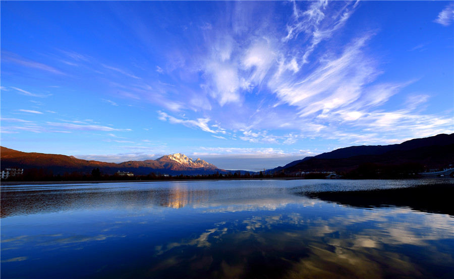我是被亮光驚醒的。我和很多水從象山腳下的黑龍?zhí)睹俺鰜怼9具艘宦暦纤???匆姾芏嗖煌拥娜?。黑頭發(fā)的人,黃頭發(fā)的人。黑眼睛的人,藍(lán)眼睛的人。我看見了潭邊的亭臺(tái)樓閣。看見了花與樹。我還順著人們遠(yuǎn)眺的目光看見了玉龍雪山,晶瑩奪目矗立在藍(lán)天下面。潭水映照雪山,真讓人目眩神迷啊。人們?cè)跇蛏希诘躺?,說著不同的語言。在不同的語言里,都有那個(gè)詞頻頻出現(xiàn):麗江,麗江。這時(shí)的麗江已經(jīng)是一座很大的城了。城里也不是只有最初筑城的納西人了。如今全中國(guó)全世界的人都要來麗江,看納西古城的四方街,看玉龍雪山。