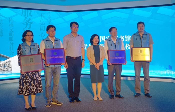 6月8日上午,國家圖書館新閱讀空間開放暨黨員志愿服務總隊成立活動在國家圖書館總館北區(qū)舉行?;顒蝇F場,國家圖書館黨委書記、副館長魏大威,國家圖書館副館長、黨委副書記陳櫻為4支黨員志愿服務分隊代表授牌。