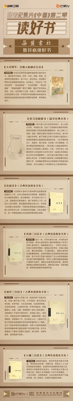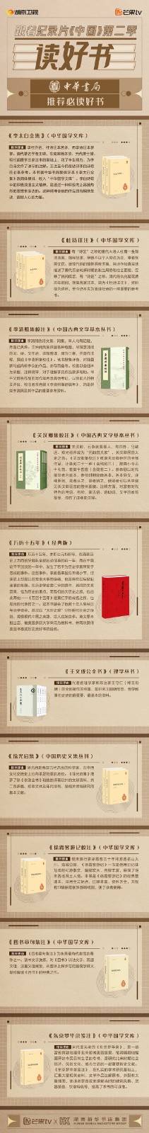 芒果TV以紀(jì)錄片《中國》第二季的精美品質(zhì),聯(lián)合湖南新華書店集團的美譽口碑,將中華書局、上海古籍出版社、岳麓書社推薦的珍品好書,傾情向大眾推薦。本次“跟著紀(jì)錄片《中國》第二季讀好書”活動,將從2月28日持續(xù)到3月15日,湖南新華書店集團旗下湖南圖書城、不吝Boolink書店、全省市級中心門店、長沙地區(qū)樂之書店等全員參與,推薦紀(jì)錄片《中國》第二季。書友及觀眾可登錄微博或到線下門店打卡參與活動。