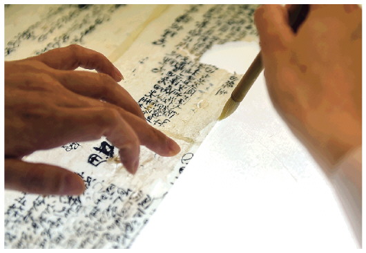 ▲5月17日,在安徽博物院文物科技保護中心紙質文物修復室,工作人員對古籍文物進行補全。新華社記者周牧攝