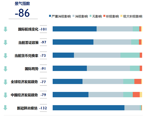 整體而言,從業(yè)者預(yù)期以上7項因素均將對2020年上半年出境旅游市場業(yè)績產(chǎn)生負(fù)面影響,導(dǎo)致整體景氣指數(shù)下降至-86。其中,正于全球蔓延的新冠疫情被認(rèn)為是限制出境旅游市場發(fā)展的最主要因素。