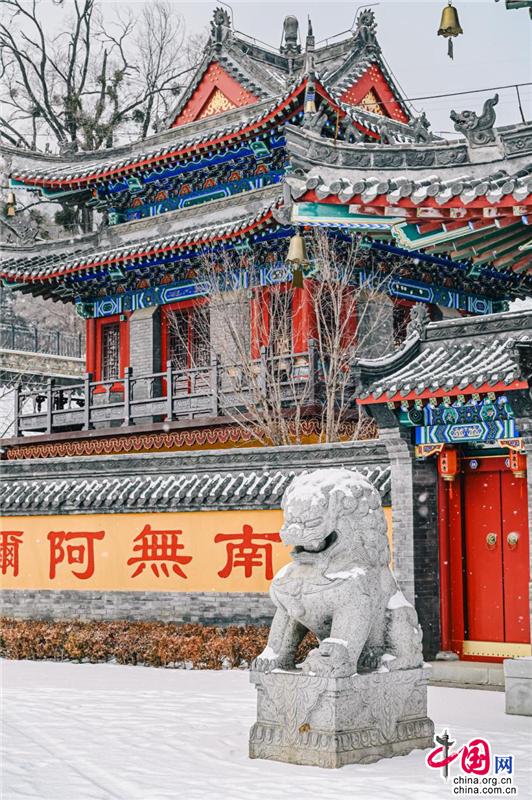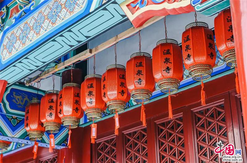 聽說這座寺廟的歷史可以追溯到400多年前,門前的石獅子十分莊嚴(yán),傳遞著佛門圣地的意境。腳踩在雪地上,發(fā)出“嘎吱嘎吱”的聲音;進入了廟內(nèi),就能看見白雪覆蓋的木質(zhì)小橋;還有廟宇內(nèi)回廊上精致的鏤空鉤花和印著“溫泉寺”字樣的燈籠。