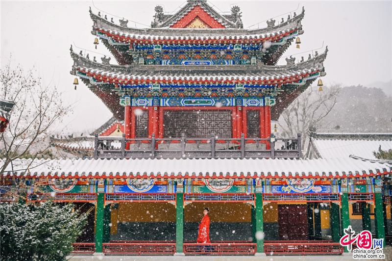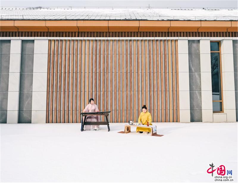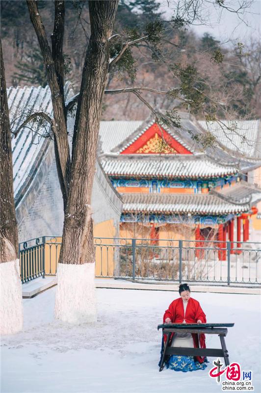 寺廟高處,古榕旁、雪地上,還有另一位古風(fēng)裝束之人在彈奏古箏,聲意蕭瑟。伴隨空靈的山河意境,飄至遠方。冬季最美的畫面,也不過如此。