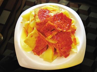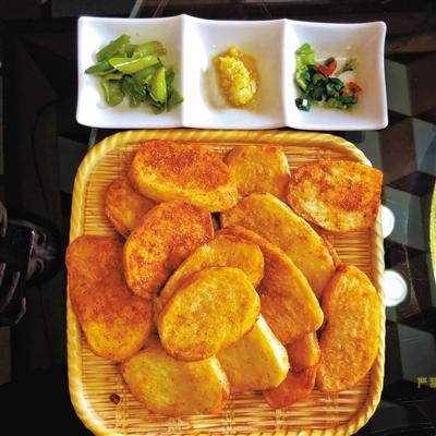 炕鍋洋芋是臨夏農(nóng)家樂(lè)里面常見(jiàn)的一道特色小吃,在臨夏,煎、烙之類(lèi)的烹飪方式都被稱(chēng)作炕,炕鍋洋芋因此得名。洋芋切片后,直接放熱油中兩面煎透。炕鍋洋芋的做法雖不復(fù)雜,但其對(duì)于火候的要求卻極其嚴(yán)苛,多一分會(huì)焦,少一分則不熟。