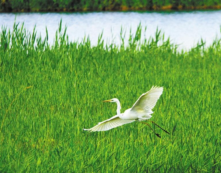 初夏的甘肅張掖國家濕地公園蘆葦青青,幾只白鷺在綠色的蘆葦中時而嬉戲飛翔,時而駐足覓食,成為濕地一道美麗風(fēng)景。 人民網(wǎng)照片