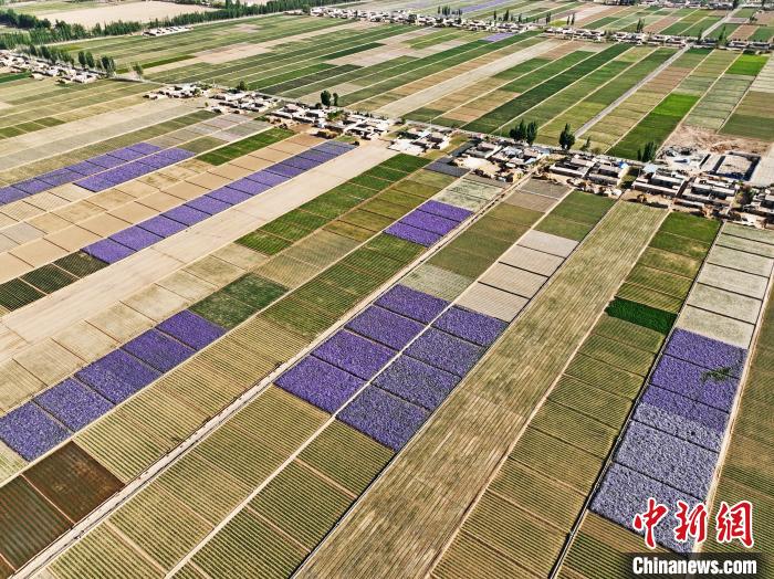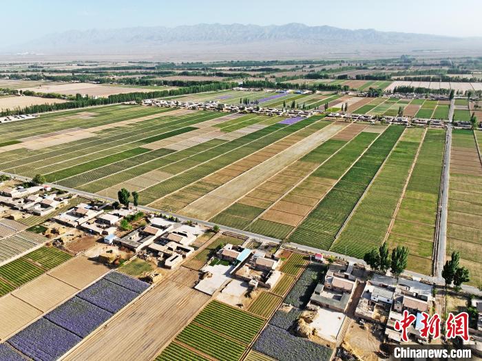 夏日時(shí)節(jié),甘肅省張掖市高臺(tái)縣駱駝城鎮(zhèn)紅新村和梧桐村的田野間,農(nóng)舍青青、遍野吐翠,阡陌縱橫間五彩斑斕,構(gòu)成一幅美麗的田園風(fēng)光畫。