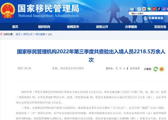 來自國(guó)家移民管理局的數(shù)據(jù)顯示,2022年第三季度,全國(guó)移民管理機(jī)構(gòu)共查驗(yàn)出入境人員2218.5萬余人次;共簽發(fā)普通護(hù)照32萬本,較第二季度增加49.5%;簽發(fā)往來港澳臺(tái)出入境證件簽注117.2萬本(枚);為在華外國(guó)人辦理簽證停留居留證件16.5萬證次。