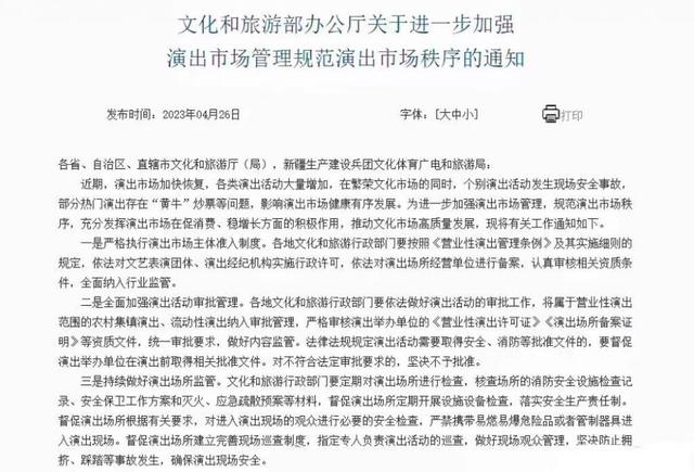 近日,文旅部辦公廳發(fā)布《文化和旅游部辦公廳關(guān)于進(jìn)一步加強(qiáng)演出市場管理規(guī)范演出市場秩序的通知》。通知提到,對臨時搭建舞臺、看臺的演唱會、音樂節(jié)等大型演出活動,文化和旅游行政部門要做好演出現(xiàn)場監(jiān)管,查驗演出舉辦單位的演出批準(zhǔn)文件及相關(guān)手續(xù),核驗演員信息及演出節(jié)目內(nèi)容,嚴(yán)禁擅自變更演員及演出內(nèi)容,嚴(yán)禁假唱、假演奏等違法違規(guī)行為。