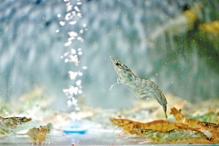 偌大的水池邊,工作人員正拿著網兜熟練地起蝦,隨著打撈大網慢慢收攏,一尾尾晶瑩剔透、活蹦亂跳的南美白對蝦跳躍出水,分揀、稱重、充氧、裝袋……