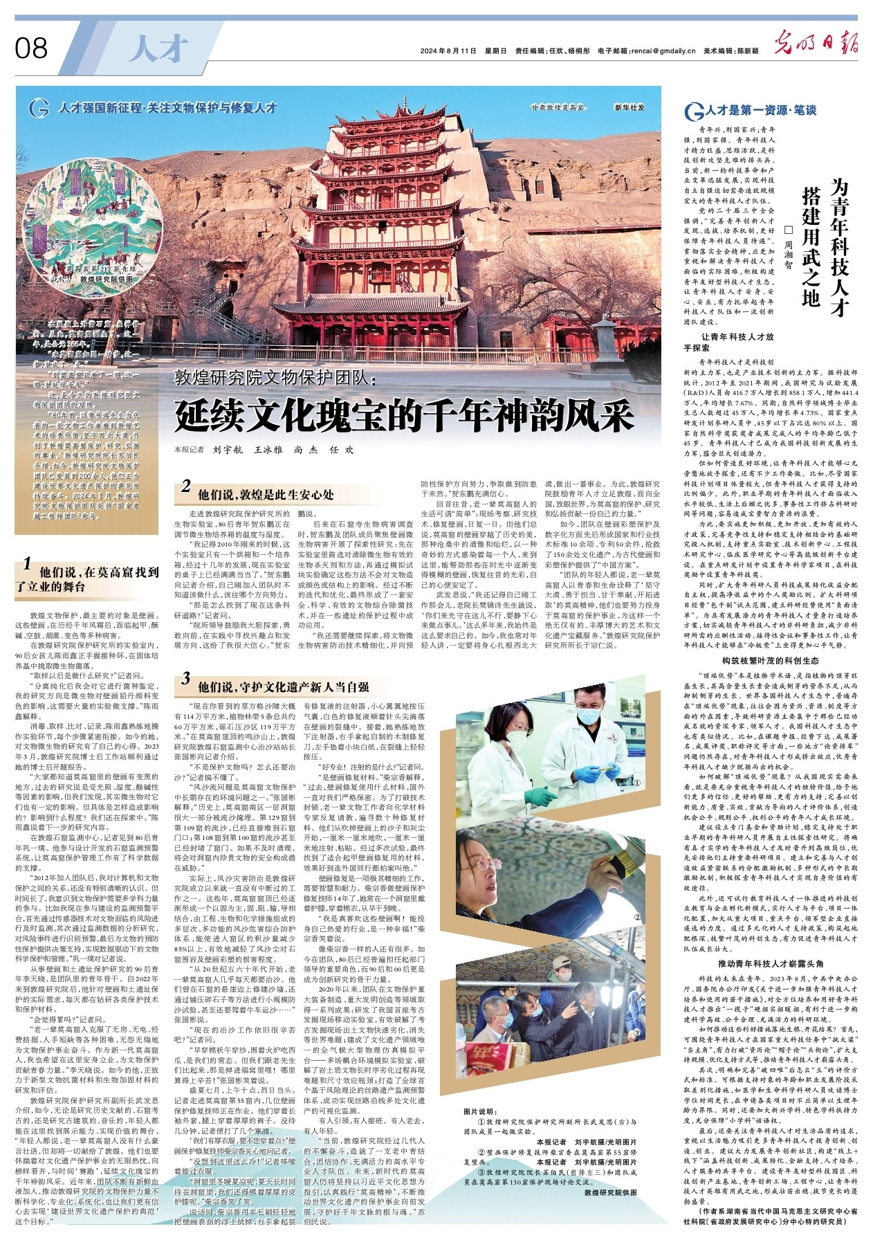 敦煌研究院保護(hù)研究所副所長(zhǎng)武發(fā)思介紹,如今,無(wú)論是研究歷史文獻(xiàn)的、石窟考古的,還是研究古建筑的、音樂(lè)的,年輕人都能在這里找到展示能力、實(shí)現(xiàn)價(jià)值的舞臺(tái),“年輕人都說(shuō),老一輩莫高窟人沒(méi)有什么豪言壯語(yǔ),但卻將一切獻(xiàn)給了敦煌。他們也要懷揣著對(duì)文化遺產(chǎn)保護(hù)事業(yè)的無(wú)限熱忱,向榜樣看齊,與時(shí)間‘賽跑’,延續(xù)文化瑰寶的千年神韻風(fēng)采。近年來(lái),團(tuán)隊(duì)不斷有新鮮血液加入,推動(dòng)敦煌研究院的文物保護(hù)力量不斷科學(xué)化、專業(yè)化、系統(tǒng)化,也讓我們更有信心去實(shí)現(xiàn)‘建設(shè)世界文化遺產(chǎn)保護(hù)的典范’這個(gè)目標(biāo)。”