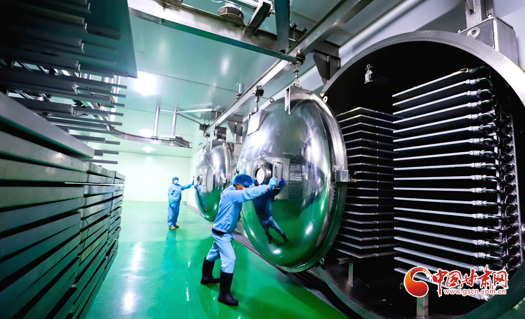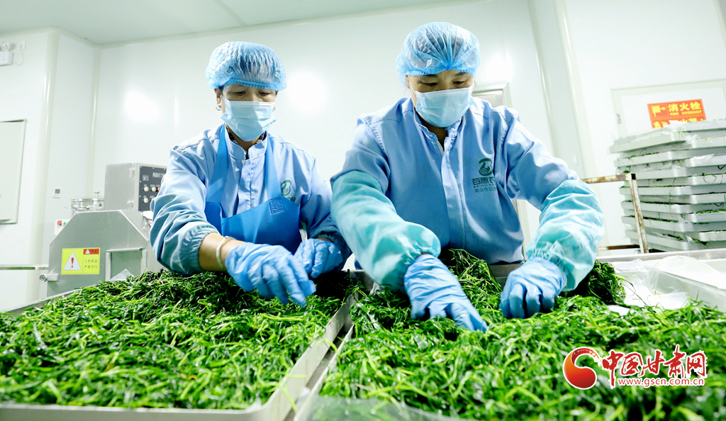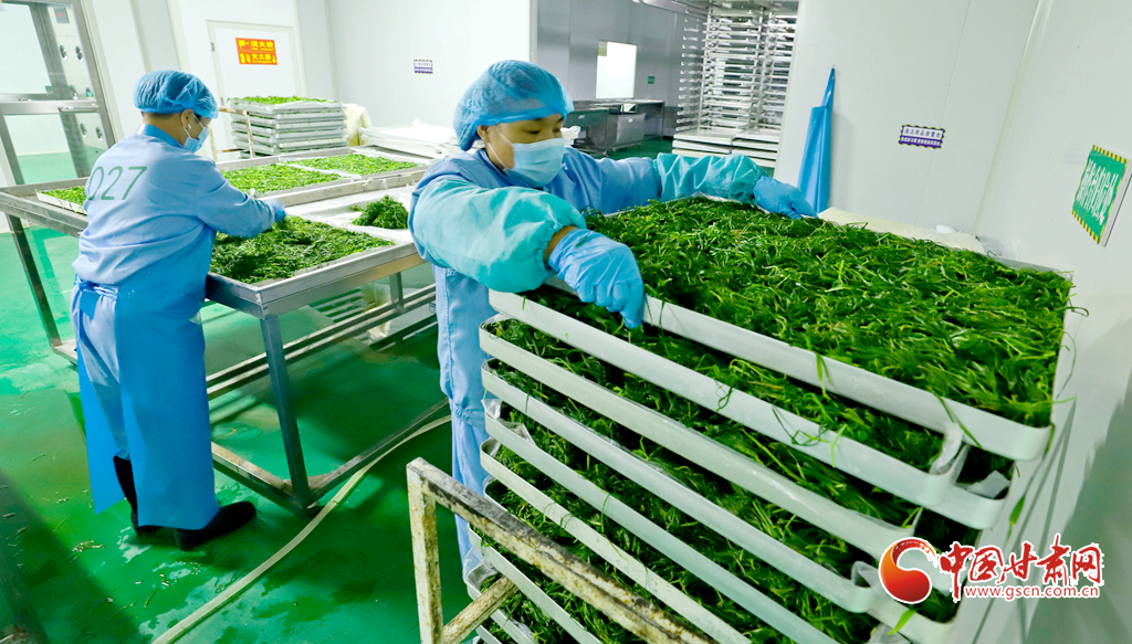 8月8日,臨澤縣沙河鎮(zhèn)一麥苗凍干粉生產線上,工作人員正在進行分揀、清洗、高溫漂燙、翻晾裝盤、凍干研磨等生產工序,完成廣東、福建、上海、浙江等地客商的訂單。