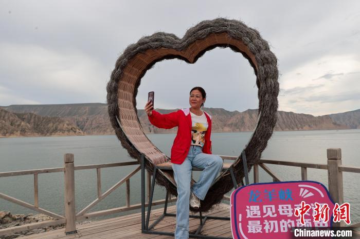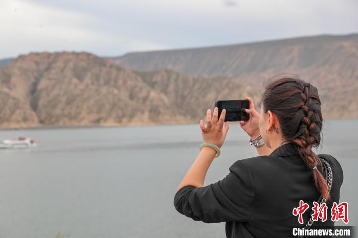 圖為游客在龍羊峽景區(qū)內(nèi)自拍留念。中新社記者 薛蒂 攝