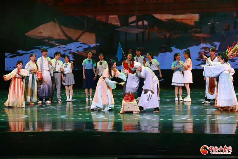 詩(shī)會(huì)以涼州詞為核心意象,主體分為“涼州·思”“涼州·行”“涼州·吟”“涼州·樂(lè)”四個(gè)篇章,各有側(cè)重又層層遞進(jìn),全方位展現(xiàn)涼州文化的多元魅力。第一篇章“涼州·思”以《天馬歌》的朗誦、《邊塞詩(shī)情》的情景劇與《鼓韻風(fēng)華》的表演,共同勾勒天馬傳奇與戍邊情懷,展現(xiàn)涼州深沉雄健的文化基因;第二篇章“涼州·行”借助AI主持與情景演繹,串聯(lián)起情景劇《跟著詩(shī)詞游武威》,以科技+文旅的視角,帶領(lǐng)觀眾開(kāi)啟了一場(chǎng)沉浸式漫游;第三篇“涼州·吟”以《西涼樂(lè)舞》、音詩(shī)畫《涼州詞》等多元舞臺(tái)形式吟誦涼州詞章的雋永風(fēng)流,對(duì)誦表演《古涼新韻》,以“古今對(duì)話”解鎖涼州文化密碼,誦讀者交替誦讀“舊八景”與“新八景”組詩(shī),從《大云晚鐘》《黃羊秋牧》等古景詩(shī),到《河西都會(huì)》《摘星小鎮(zhèn)》等新景作,舞臺(tái)上“聲、形、畫、墨”交織,盡顯涼州古今風(fēng)貌,引得觀眾沉醉鼓掌;第四篇“涼州·樂(lè)”情景再現(xiàn)了《涼州夜宴》,品味葡萄美酒中的絲路情韻;尾聲“詩(shī)意涼州·藝游武威”,全場(chǎng)共同唱響對(duì)涼州的禮贊,并以“等你在涼州”發(fā)出誠(chéng)摯邀約,讓千年涼州的詩(shī)意與魅力,在新時(shí)代持續(xù)綻放光彩。
