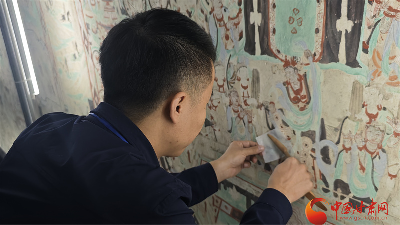 敦煌研究院文物保護技術服務中心年輕的文物保護員唐青松有幸成為修復團隊一員,開啟在敦煌莫高窟修壁畫的時光。