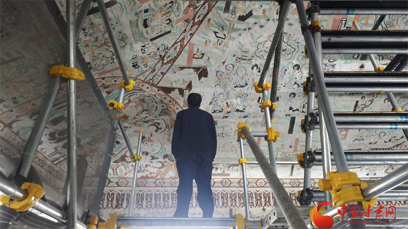 為了配合壁畫、彩塑修復,第55窟共搭建了5層腳手架。修復師仰頭、彎腰、躺著作業(yè)是常態(tài),修復塑像時,甚至要跪著、趴著鉆進狹小空間,一待就是數(shù)小時,起身時腰酸背痛、腿腳發(fā)麻。